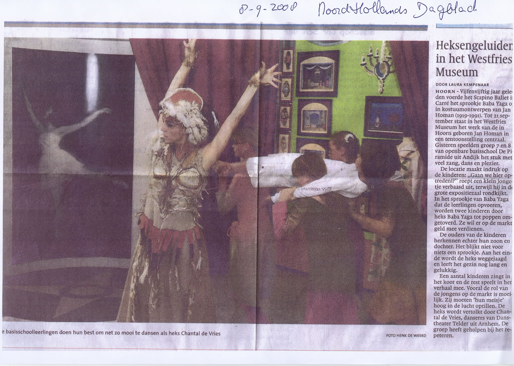 Een presentatie van een danseres en een klas van 30 kinderen om een tentoonstelling van kunstenaars Jan en Jetty Homan in beweging te brengen. Dit vindt plaats in het West Fries Museum te Hoorn. Onderdeel van deze tentoonstelling zijn ontwerpen van Jan Homan voor de dansvoorstelling Baba Yaga in de jaren ’50 voor het Scapino Ballet. Paula Walta maakt een eigen versie aan de hand van het Russische sprookje over Baba Yaga, de heks die woont in een huisje met kippenpoten. Chantal de Vries danst en zingt Baba Yaga, de kinderen vertolken alle andere rollen. Kostuums: Mona Veld.